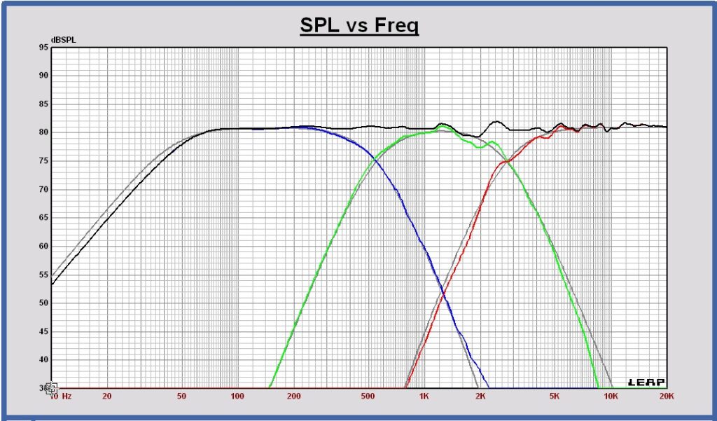 woofer in blue, midrange in green, tweeter in red, sum in black